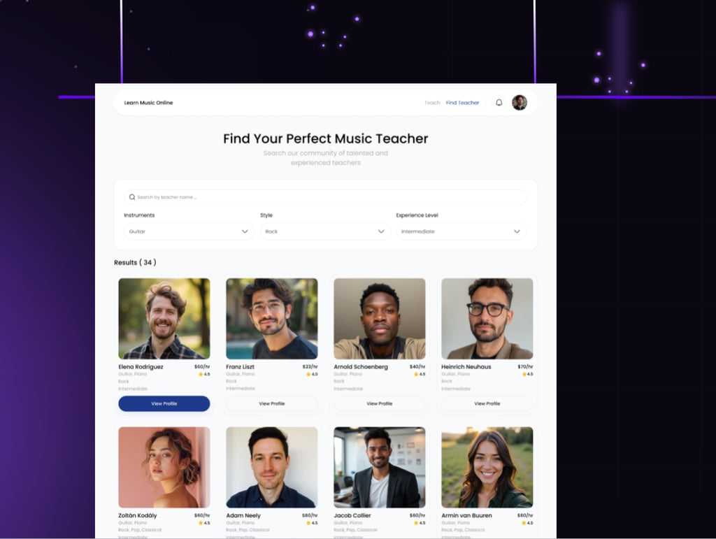 An online platform for live music instruction, created with a Grammy and Peabody winning arts executive to connect students with expert teachers in real time.