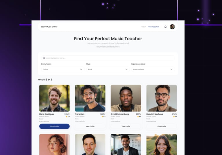 An online platform for live music instruction, created with a Grammy and Peabody winning arts executive to connect students with expert teachers in real time.